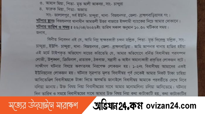 ব্রাহ্মণবাড়িয়া বিজয়নগরে বাবার সম্পত্তি থেকে বঞ্চিত করার অভিযোগ উঠেছে। সূত্রে জানা যায়, উপজেলা সাতবর্গ মৌজায় বি,এস ৯৫১ দাগের ৩৩ শতক ভূমি বাবতে ৬১৯ নং বি,এস খতিয়ানের মালিক আব্দুল হাসিমের ছেলে read more