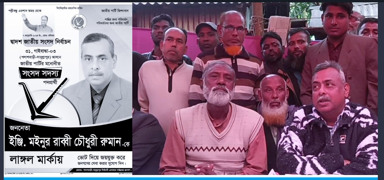 ২৩ ডিসেম্বর বিকেলে সাদুল্লাপুর উপজেলা জাতীয় পার্টির অস্থায়ী কার্যালয়ে উপজেলা সভাপতি আজিজার রহসান বিএসসি’র সভাপতিত্বে আয়োজিত আলোচনা সভায় প্রধান অতিথি হিসেবে বক্তব্য রাখেন ৩১, গাইবান্ধা -৩, সাদুল্লাপুর-পলাশবাড়ী আসনে জাতীয় পার্টির মনোনীত লাঙ্গল প্রতীকের প্রার্থী ইঞ্জিনিয়ার মইনুর রাব্বি চৌধুরী রুমান।
