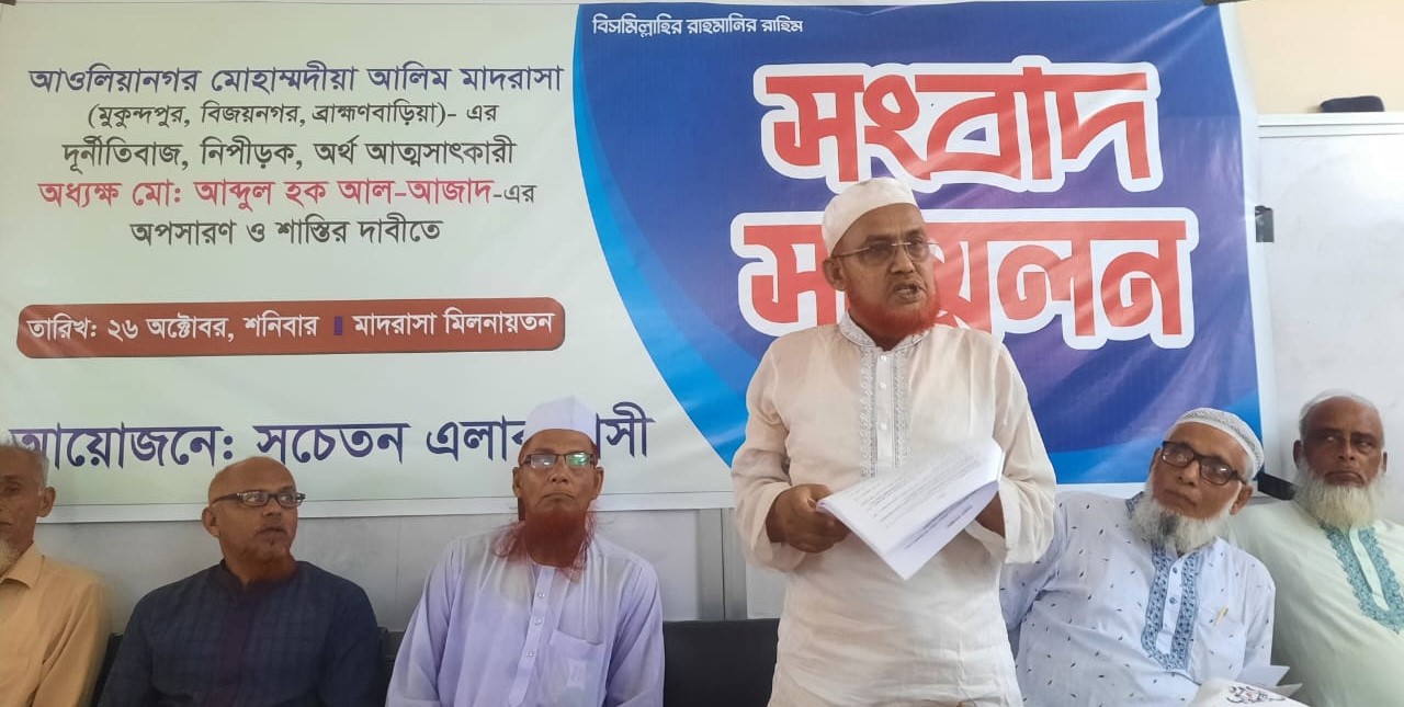 ব্রাহ্মণবাড়িয়ার বিজয়নগরে আউলিয়া নগর মোহাম্মাদিয়া আলিম মাদ্রাসার অধ্যক্ষের অপসারনের দাবীতে সংবাদ সম্মেলন করেছেন এলাকার সুশীল সমাজের নেতৃবৃন্দ । ২৬ অক্টোবর (শনিবার) দুপুর ১২ টার সময় উপজেলার আউলিয়া বাজার মাদ্রাসার উক্ত সম্মেলন অনুষ্ঠিত হয় ।