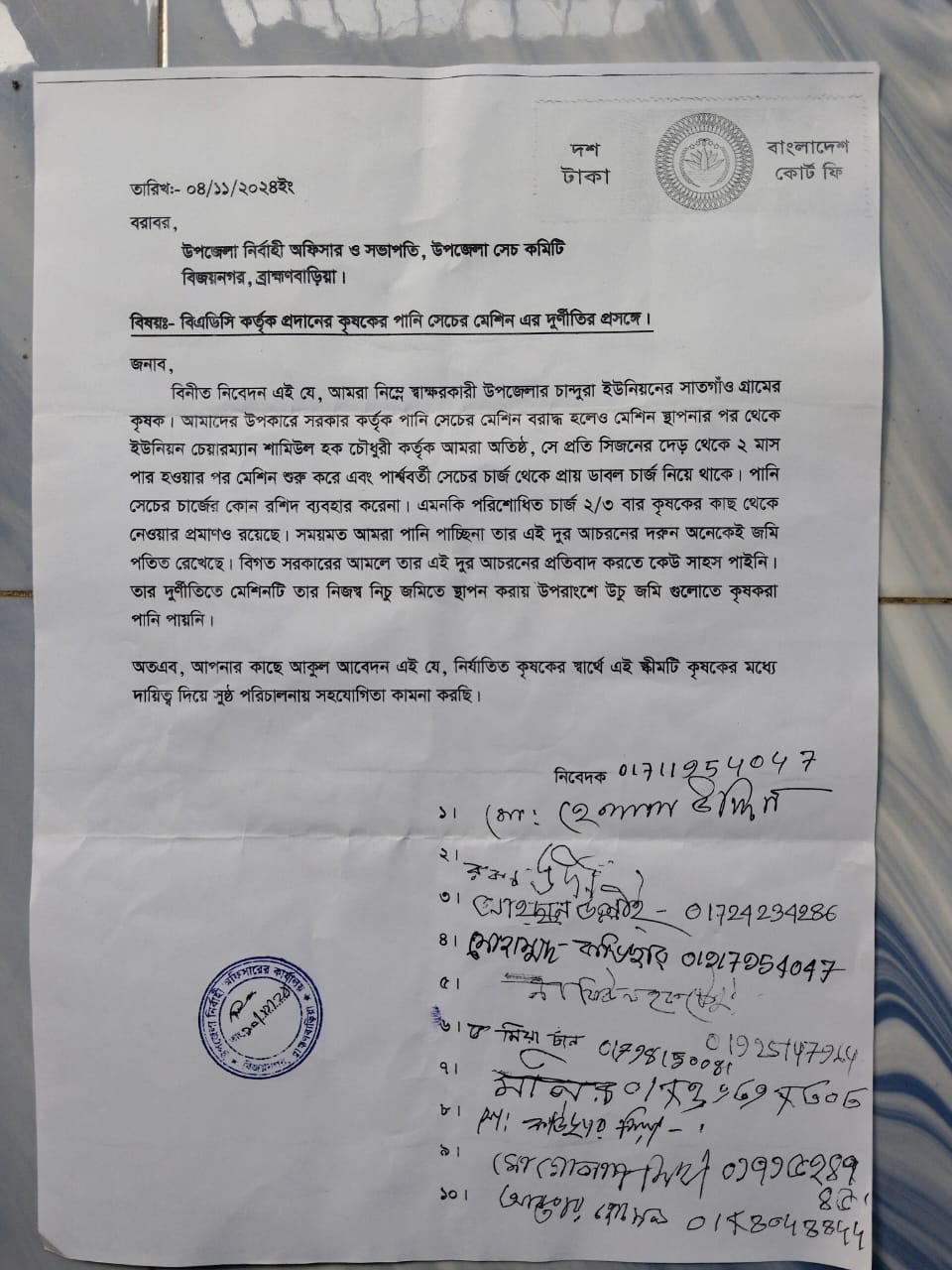 ব্রাহ্মণবাড়িয়ার বিজয়নগরের চান্দুরা ইউনিয়নের সাতগাঁও গ্রামে বিএডিসি কর্তৃক প্রদানের কৃষকের পানি সেচের মেশিন ক্ষমতার অপব্যবহার করে নিজের ব্যক্তি মালিকানাধীন ব্যবহার করার অভিযোগ উঠেছে। এতে সাধারণ কৃষক ভোগান্তিতে পড়ছে এবং কৃষি উৎপাদন ব্যহত হচ্ছে। এ নিয়ে ১০ই নভেম্বর (রবিবার) গ্রামের কৃষক মালিকসহ ১০জন স্বাক্ষরিত উপজেলা সেচ কমিটির সভাপতি ও উপজেলা নির্বাহী অফিসার বরাবর লিখিত অভিযোগ দাখিল করেছেন। অভিযোগ সূত্রে জানা যায়, চান্দুরা ইউনিয়ন পরিষদের চেয়ারম্যান এ এম শামিউল হক চৌধুরী তার একক কর্তৃত্বে সরকারি বরাদ্দের সেচ মেশিন কৌশলে স্কিমের নিম্নভাগে তার নিচু জমিতে স্থাপন করায় উপরাংশে উচু জমিতে পানি দিতে কষ্ট পোহাতে হয়। তার এই একক কর্তৃত্বে কৃষকরা অতিষ্ঠ। এমনকি নিজের আর্থিক সুবিধা নিতে নির্দিষ্ট সময়ের এক থেকে দেড় মাস পর মেশিন চালু করেন এবং পার্শ্ববর্তী যত সেচ মেশিন আছে তাদের থেকে অতিরিক্ত চার্জ আদায় করেন। এতে কোন রশিদ ব্যবহার না করে ছোট টুকরা কাগজ ব্যবহার করেন। হারিয়ে ফেললে আবারও দিতে হয়। এমন আচরণে অনেকে জমি কৃষকরা পতিত রেখেছেন। আওয়ামী সরকারের সময়ে প্রতিবাদ করতে কেউ সাহস পায়নি।