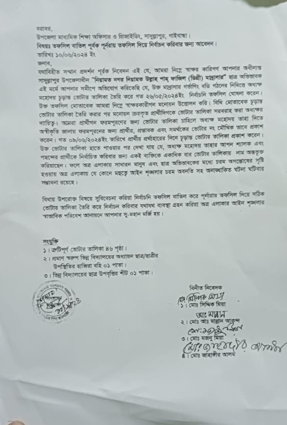 ১০ শে জুন সোমবার এবিষয়ে গাইবান্ধা জেলা প্রশাসক সহ সাদুল্লাপুর উপজেলা মাধ্যমিক শিক্ষা অফিসার ও প্রিজাইডিং অফিসার মোঃ আবুল হোসেন বরাবরে লিখত অভিযোগ দায়ের করলেও সংশ্লিষ্ট কর্তৃপক্ষ কোনো পদক্ষেপ গ্রহণ না করায় ব্যপক উত্তেজনা বিরাজ করছে অভিভাবক সদস্য প্রার্থী ও এলাকাবাসীর মাঝে। অনতিবিলম্বে নতুন ভোটার তালিকা প্রস্তুত করে ঘোষিত তফসিল বাতিল করে পূণরায় তফসিল ঘোষণা করে সুষ্ঠু নির্বাচনের দাবি জানিয়েছেন অভিভাবক সদস্য প্রার্থী ও এলাকাবাসী।