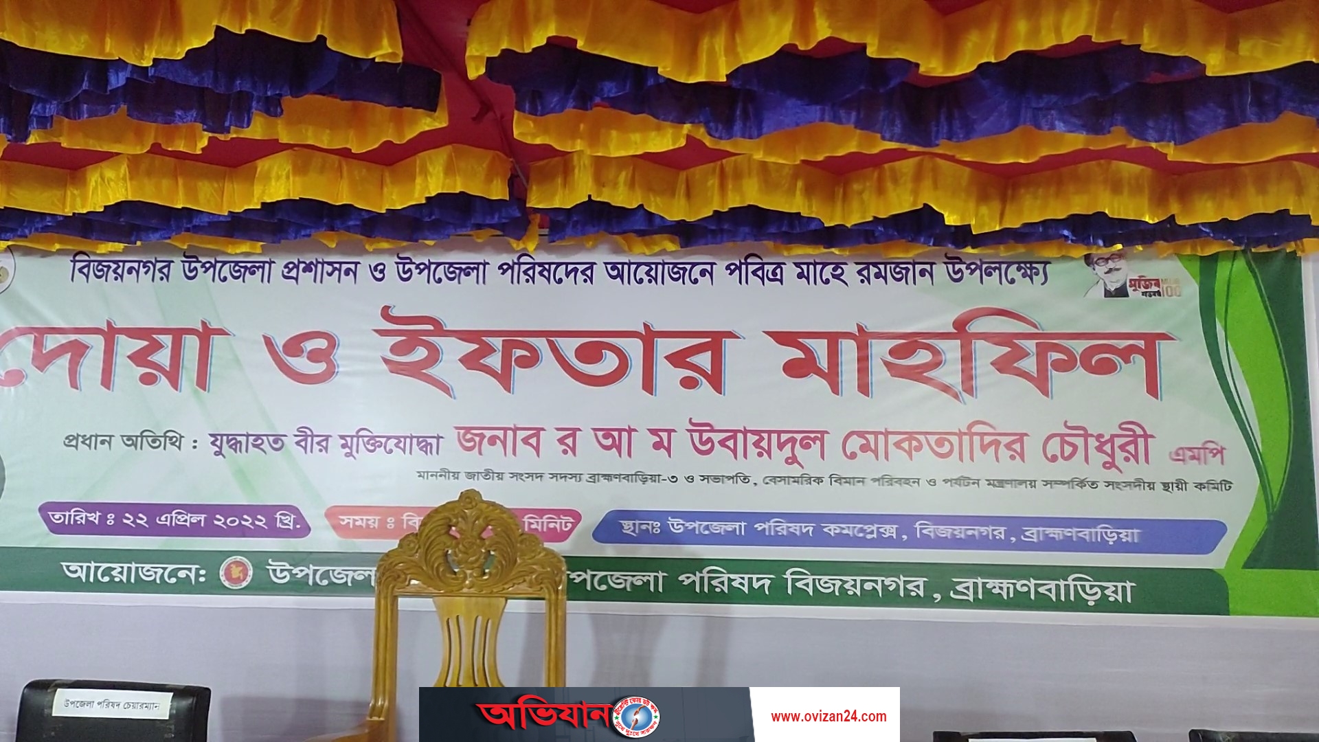 ব্রাহ্মণবাড়িয়ার বিজয়নগরে উপজেলা প্রশাসনের আয়োজন ইফতার ও দোয়ার মাহফিলের আয়োজন করা হয়েছে। ২২ এপ্রিল শুক্রবার বিকাল ৫ টার সময় বিজয়নগর উপজেলা প্রাঙ্গণে আয়োজিত ইফতার ও দোয়ার মাহফিলে প্রধান অতিথি হিসেবে