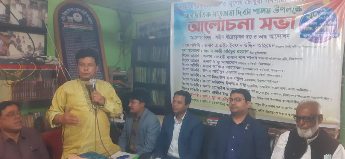 বিজয়নগর ( ব্রাহ্মণবাড়িয়া) প্রতিনিধি: ব্রাহ্মণবাড়িয়া বিজয়নগরে আন্তর্জাতিক মাতৃভাষা দিবস উপলক্ষে শহীদ ধীরেন্দ্রনাথ দত্ত ও ভূপেশ চৌধুরীর গনপাঠাগারে আলোচনা সভা অনুষ্ঠিত হয়েছে। ২৩ই ফেব্রুয়ারী সকাল ১০ টার সময় র গনপাঠাগার চত্তরে,