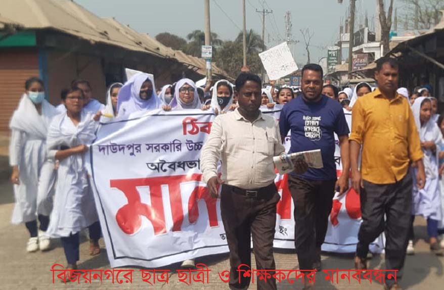 মুজিবুর রহমান সুজন,বিজয়নগর ( ব্রাহ্মণবাড়িয়া) প্রতিনিধি : ব্রাহ্মণবাড়িয়ার বিজয়নগরে সরকারি বিদ্যালয়ে অবৈধভাবে মাটি বিক্রয়ের প্রতিবাদে মানববন্ধন করেছেন উক্ত প্রতিষ্ঠানের ছাত্রী ছাত্রী ও শিক্ষকবৃন্দরা। সরে জমিনে জানা যায়, উপজেলার দাউদপুর সরকারি