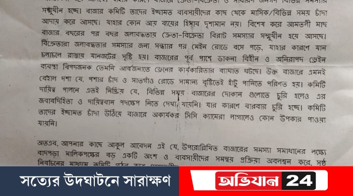 অভিযান ২৪ ডেস্ক: ব্রাহ্মণবাড়িয়া বিজয়নগরে চান্দুরা ইউনিয়নের আমতলী বাজার কমিটির বিরুদ্ধে অনিয়মের অভিযোগ করেছেন বাজারের মালিক ব্যবসায়ীরা। ২৩শে জুন (রবিবার) বিজয়নগর উপজেলা নির্বাহী অফিসারের কার্যালয়ে বাজারের ৭জন মালিক ব্যবসায়ী এ