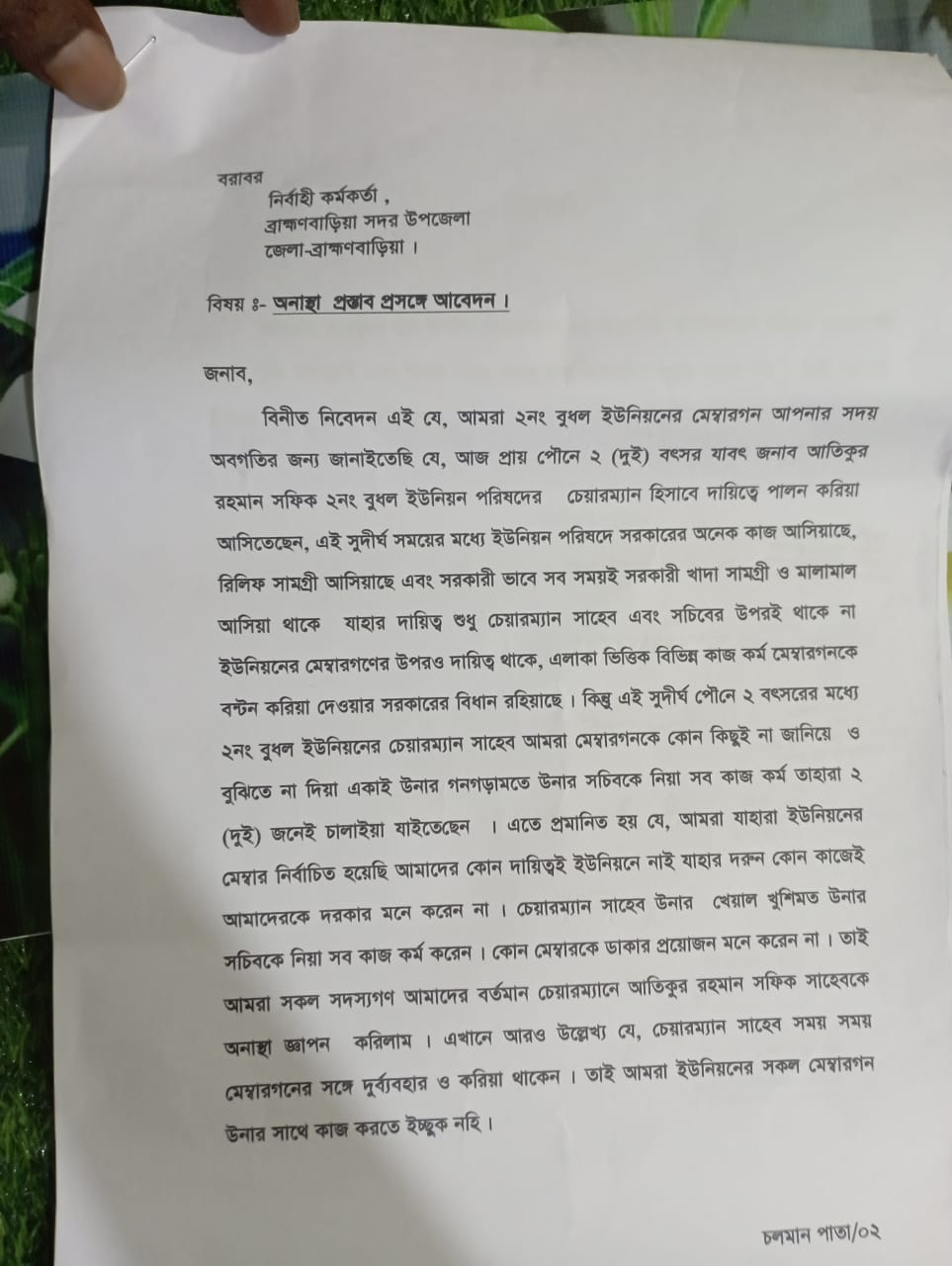ব্রাহ্মণবাড়িয়া সদর উপজেলার বুধল ইউনিয়নের চেয়ারম্যান আতিকুর রহমান সফিকের (৪৫) বিরুদ্ধে উক্ত পরিষদের মেম্বারগণ অনাস্থা প্রদান করেছেন ।